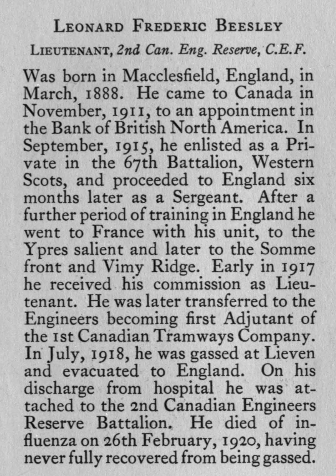 Beesley L F Lt 2nd Canadian Engineers