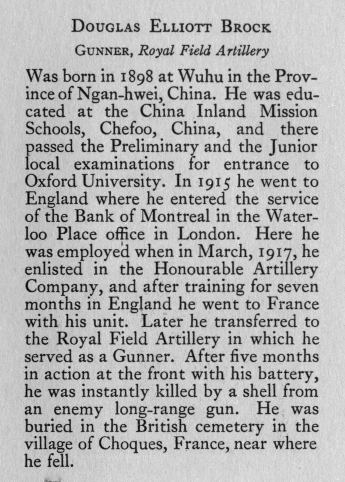 Brock D E Gnr 625749 Royal Field Artillery