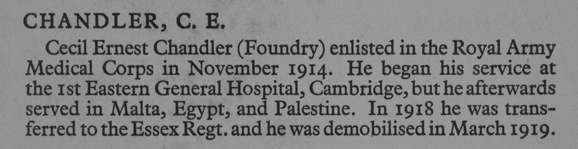 Chandler C E Pte 203714 4th Essex Regiment Cecil Ernest Chandler (Foundry) enlisted in the Royal Army Medical Corps in November 1914. He began his service at the 1st Eastern General Hospital, Cambridge, but he afterwards served in Malta, Egypt, and Palestine. In 1918 he was transferred to the Essex Regt. and he was demobilised in March 1919. ![]() Source : War Record Of Cambridge University Press 1914-1919 |