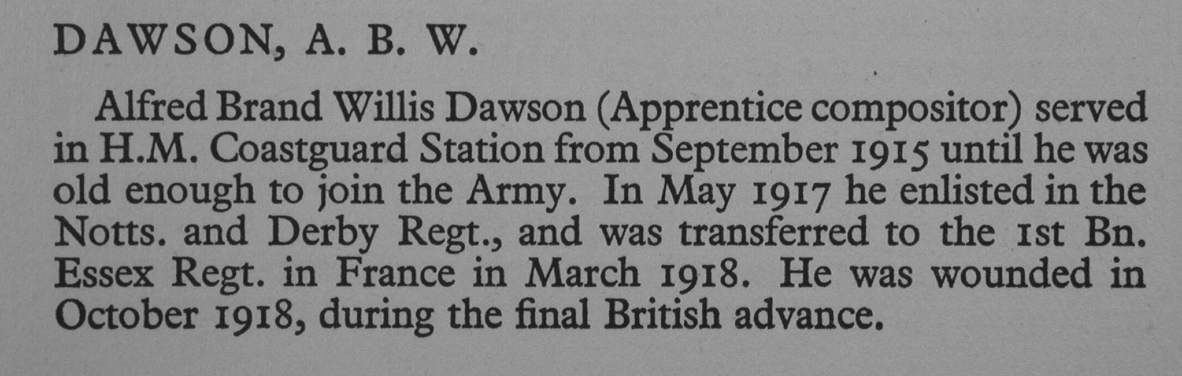 Dawson A B W Pte 1st Essex Regiment Alfred Brand Willis Dawson (Apprentice compositor) served in H.M. Coastguard Station from September 1915 until he was old enough to join the Army. In May 1917 he enlisted in the Notts. and Derby Regt., and was transferred to the 1st Bn. Essex Regt. in France in March 1918. He was wounded in October 1918, during the final British advance. ![]() Source : War Record Of Cambridge University Press 1914-1919 |