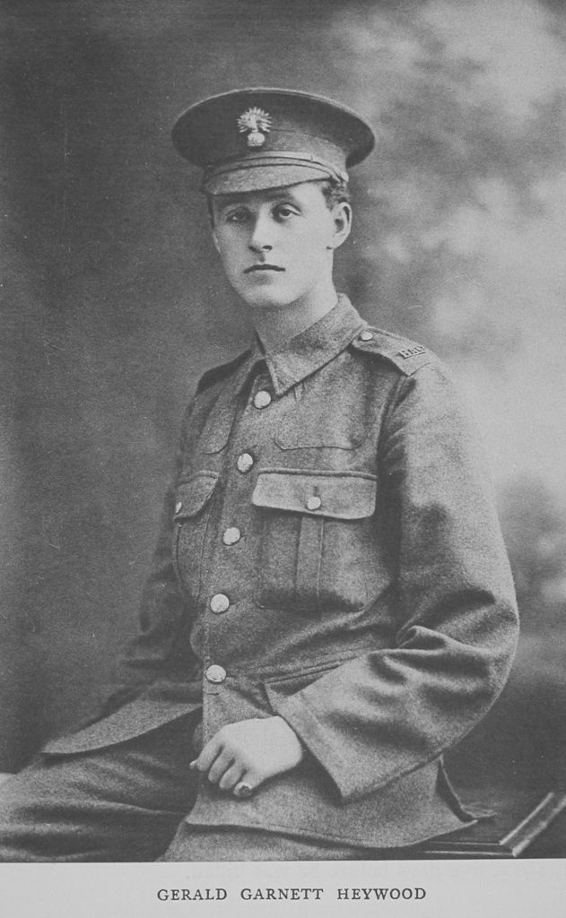 GERALD GARNETT HEYWOOD was the second son of James Garnett and Alice M. de Quincey Heywood, of Chislehurst. He entered the School in 1906, and left in 1910 for Hertford College,