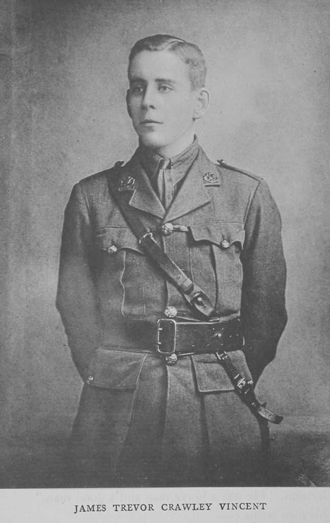 JAMES TREVOR CRAWLEY VINCENT Was the only son of Hugh Corbet Vincent, of Bronwydd, Bangor, N. Wales, and of Bronwen Adelaide his wife.