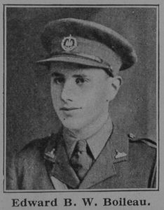 BOILEAU, EDWARD BULMER WHICHER, Lieut., 1st Battn. (39th Foot) The Dorset Regt., 2nd s. of Capt. Thomas Smalley Boileau, late 2nd Dorset Regt. and I.S.C., of 97, South Croxted Road, West Dulwich, S.E., by his wife, Selina Mary, dau, of James Whicher, Deputy Inspector-General of Hospitals and Fleets; b. Folkestone, co. Kent, 1 Sept. 1898; educ. Imperial Service College, Windsor, and the Royal Military College, Sandhurst; gazetted 2nd Lieut. 1st Dorset Regt. 19 July, 1916; promoted Lieut. 19 Jan. 1918; served with the Expeditionary Force in France and Flanders from 24 Nov. 1917; was appointed Lewis Gun Instructor during 1918, and Assistant Adjutant in Sept. 1918, and during the Battle of Damery 11 Aug. 1918, he acted as Liaison Officer to the Brigadier-General. On 8 Aug. 1918, he was chosen to take one sergeant-major and 16 men to represent the battalion at an inspection by the King: and was killed in action at Sequchart, near St. Quentin, 3 Oct. 1918. Buried at Ste. Hélène British Military Cemetery, Pontruet. His Commanding Officer wrote: “He was always willing and thoroughly reliable, and always carried out his duties bravely; was cheerful, respected and loved both by officers and men.” and the Major: “His death has been a blow to all who knew him in the battalion. He was loved and esteemed not only by the officers, but especially by the men of the Headquarters Company, which he commanded. He was killed while going forward in the recent attack, in which the battalion did so well, and at a moment when he was doing his duty.” Unm.