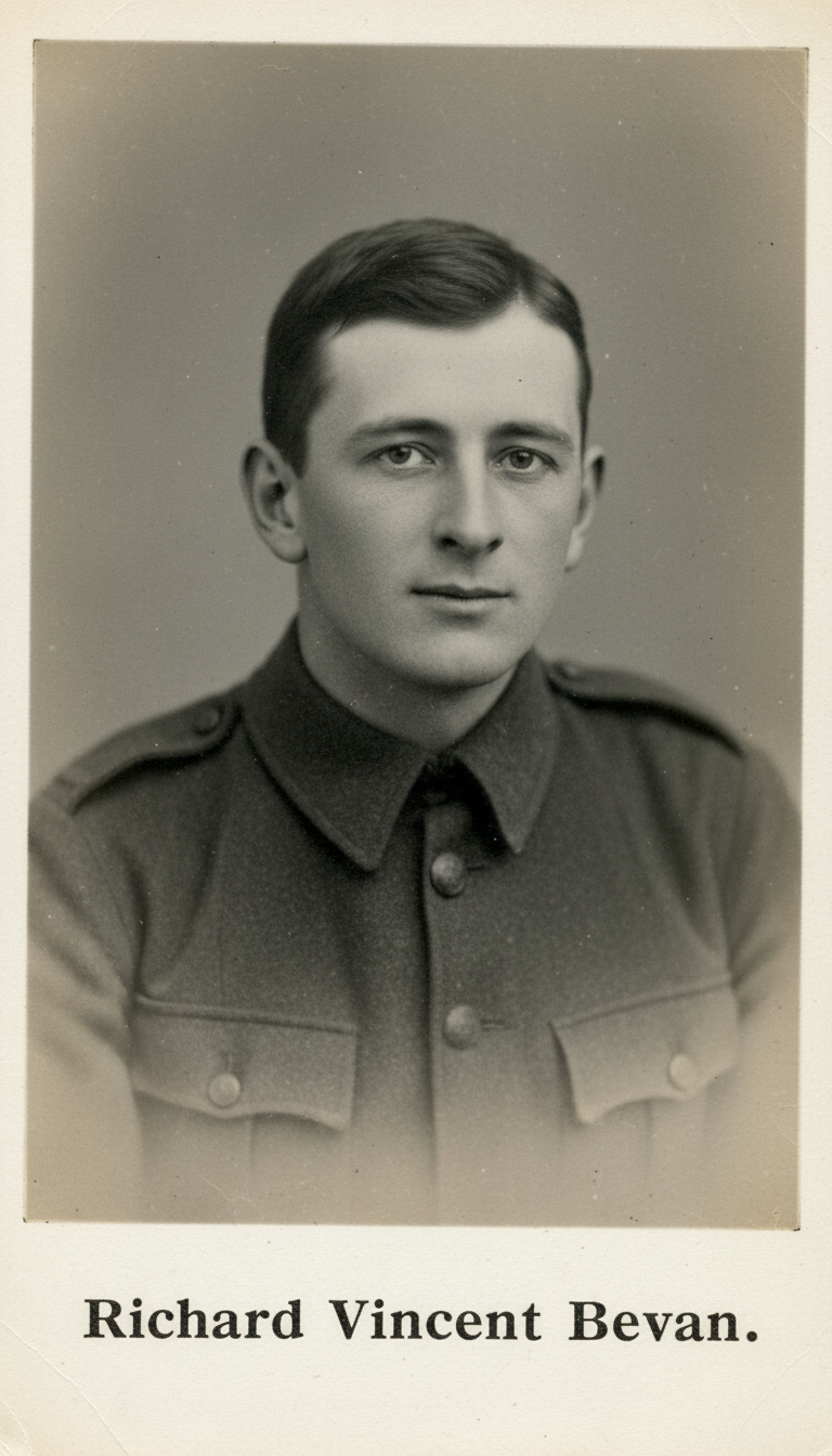 BEVAN, RICHARD VINCENT, Private, 5th Battn. (City of London) The London Regt., The London Rifle Brigade, s. of Richard Bevan, of 31, Girdler’s Road, Brook Green, W., L.R.C.P.L., D.P.H., etc., Alderman of Hammersmith; b. Lydd, co. Kent, 22 March, 1893; educ. at Colet Court and St. Paul’s School (foundation scholar), where he gained the Huxley scholarship; was in the St. Paul’s O.T. Corps, and joined the London Rifle Brigade, 1911. At the time he was called up with his regt., he was a medical student and Huxley Scholar at Charing Cross Hospital Medical School, and was an under-graduate of the London University. He was shot, while in “Plugstreet” Wood with his section, 10 Dec. 1914, and died two days later at Bailleul Clearing Hospital from his wounds; buried in Bailleul Cemetery; unm. Bevan was in the Gymnasium eight at St. Paul’s and reserve man at the Aldershot Public School Competition. He played Rugby for the Old Pauline A team and for the Charing Cross Hospital Rugby team.