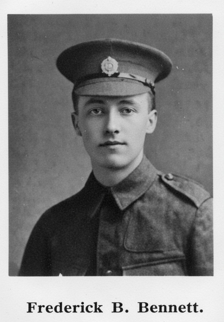 BENNETT, FREDERICK BENJAMIN, Private, No. 1115, 1/5th Battn. (London Rifle Brigade) The London Regt. (T.F.), only s. of Benjamin Bennett, of 17, Airlie Gardens, Ilford, Clerk, by his wife, Alice Eliza, dau. of William Hudson, of Dalston, N.E.; b. Leyton, co. Essex, 16 June, 1896; educ. Cleveland Road Council School, Ilford, and St. George’s College, London; entered H.M. Customs as a boy clerk after competitive examination, remaining until he reached the age limit of eighteen, and was preparing for the Second Division Civil Service when war broke out. He had served a year and eight months in the Civil Service Cadets, and after passing his examination joined the London Rifle Brigade in Oct. and was picked for the drafts for the 1st Battn. at the end of Jan. He had been at the Front scarcely three weeks when, about 1 a.m. on 12 March, 1915, he was mortally wounded while on sentry duty in the trenches at Ploegsteert Woods. The Sergt. of his platoon wrote: “Your son was in my platoon and was on sentry duty in the trench on the night of the 11th-12th. At about 1 a.m. a star light was sent up by the enemy over his trench, followed immediately by a volley. Unfortunately one of the shots struck your son on the left side of the head level with the left eye. He was picked up at once and sent to the field ambulance without any delay. The wound was a very severe one, and he died the following morning about 11 a.m. . He was a fine manly chap and did his duty with the best.” He was a server at St. Clement’s Parish Church, Ilford, and was for some time secretary of the Young Men’s Guild.