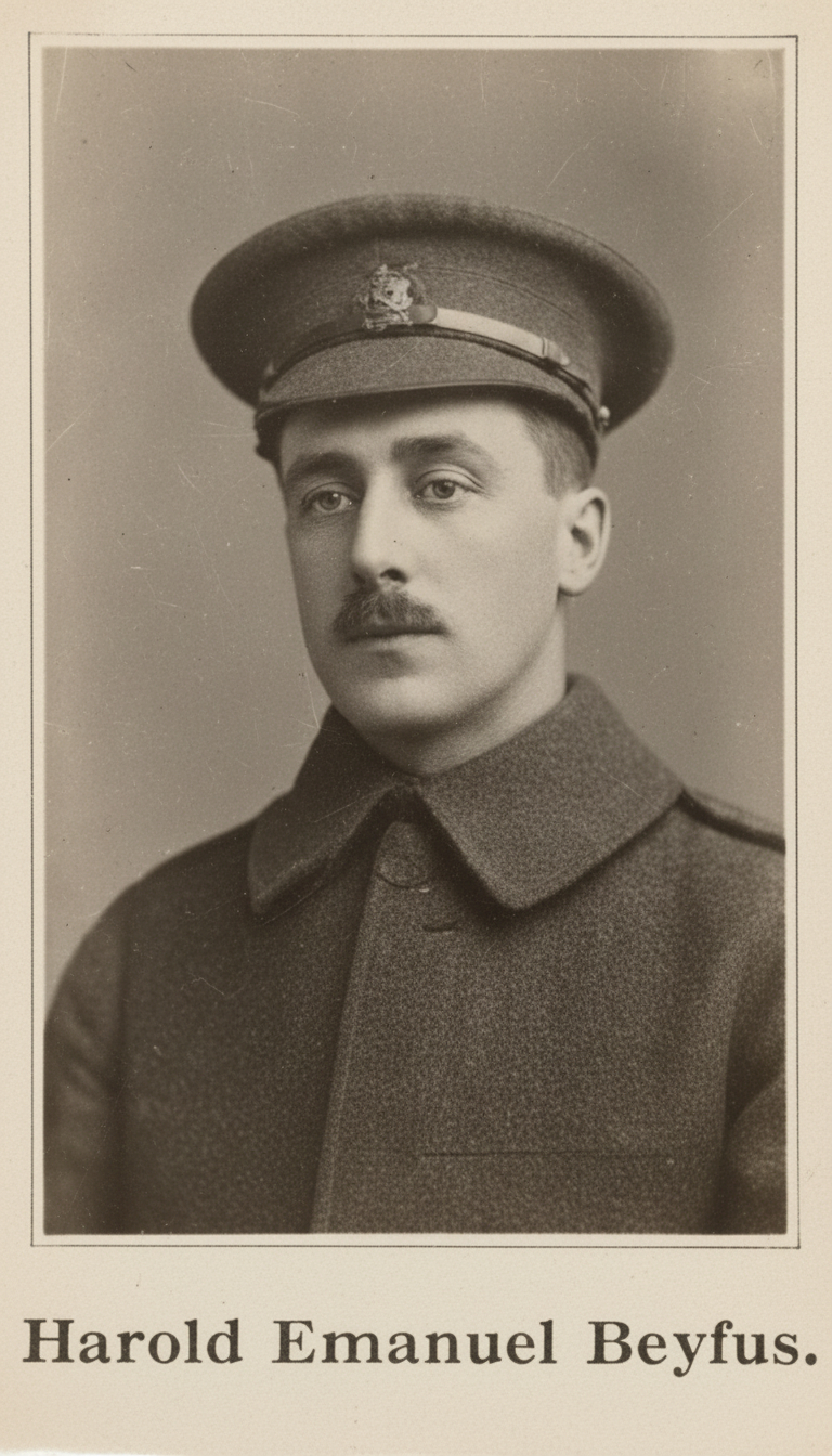 BEYFUS, HAROLD EMANUEL, Private, No. 225, 5th Battn. (Rifle Brigade) The London Regt., yr. s. of Albert Lewis Beyfus, of 3, Park Place Villas, Maida Hill, W., Precious Stone Merchant and Broker, by his wife, Essie, dau, of Benjamin de Frece, of New York, U.S.A.; b. Maida Hill, W., 26 April, 1886; educ. Gower St. University School, and Kahn’s Institute, Brussels; joined the London Rifle Brigade after the outbreak of war in Aug. 1914; was wounded in the head, in action at Hill 60, 1 May, 1915, and died in hospital at Boulogne two days later; unm.