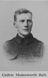 BELL, CEDRIC MOLESWORTH, Private, No. 9215, 5th Battn. (London Rifle Brigade) The London Regt., s. of Angus Alger Bell, of 120, Wightman Road, N., Chief Accountant at the Royal Academy of Music, and Sergt.-Major 5th London Brigade, R.F.A., by his wife, Agnes, dau. of Thomas Bell Weeks; b. Harringay, 22 May, 1893; educ. Owen’s School, Islington; joined the London Rifle Brigade in 1911, and volunteered for foreign service on the outbreak of war. He went to the Front in Nov. 1914, and on 4 Dec. was wounded in action by shrapnel and invalided home. He rejoined his regt. in France in March, 1915, was wounded by shell fire on 26 April, 1915, during the attack on Hill 60, and died before reaching the casualty clearing station; He was buried in Bailleul Cemetery. unm.