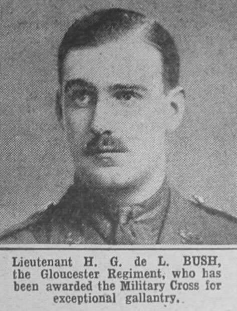 BUSH, H. G. DE LISLE, M.C., Lieut., The Gloucestershire Regt., eldest s. of G. de Lisle Bush, of Eastington Park, co. Gloucester; educ. Park Hill, Lyndhurst, and Eton; obtained a commission; served with the Expeditionary Force in France and Flanders; was awarded the Military Cross for gallant conduct in the field, having rescued under heavy fire and brought again into action one of his machine guns with its complement of men, which had been buried by a shell; he was also mentioned in Despatches for gallant and distinguished service in the field. He took part in the Battle of Loos in 1915, and received wounds from which he died 17 Jan. 1917, in the Military Hospital for Officers at Torquay. He was a keen sportsman, and enthusiastic rider to the late Lord Fitzhardinge’s hounds, and an excellent shot; m.