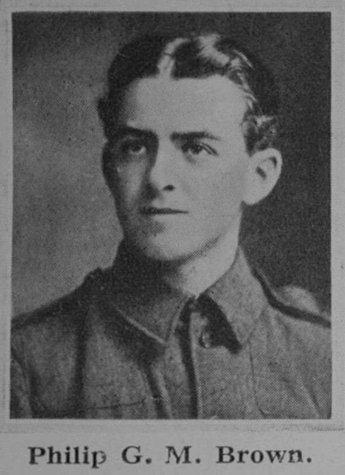 BROWN, PHILIP GEORGE MORTIMER, Private, No. 9704, 5th Battn. (London Rifle Brigade) The London Regt. (T.F.), only s. of the late Frederick Robert Brown, Solicitor, by his wife, Emily Louisa (Thirlmere, Dukesthorpe Road, Sydenham, S.E.), dau. of George Phillips, of Beckenham; b. Sundridge Park, co. Kent, 15 Oct. 1896; educ. The Hall, Sydenham Preparatory School, and Dulwich College. He joined the London Rifle Brigade early in 1914, and on the outbreak of war was with his regt. at Eastbourne for the midsummer manœuvres. Volunteering for foreign service, he left with his regt. for France early in Nov. 1914, and was killed in action at Ypres, 3 May, 1915; unm. His commanding officer wrote: “He died doing his duty to the last, and was buried the same night. After he was slightly wounded himself, he spent all his time attending to other wounded friends, and it was whilst performing this duty that he was killed,”