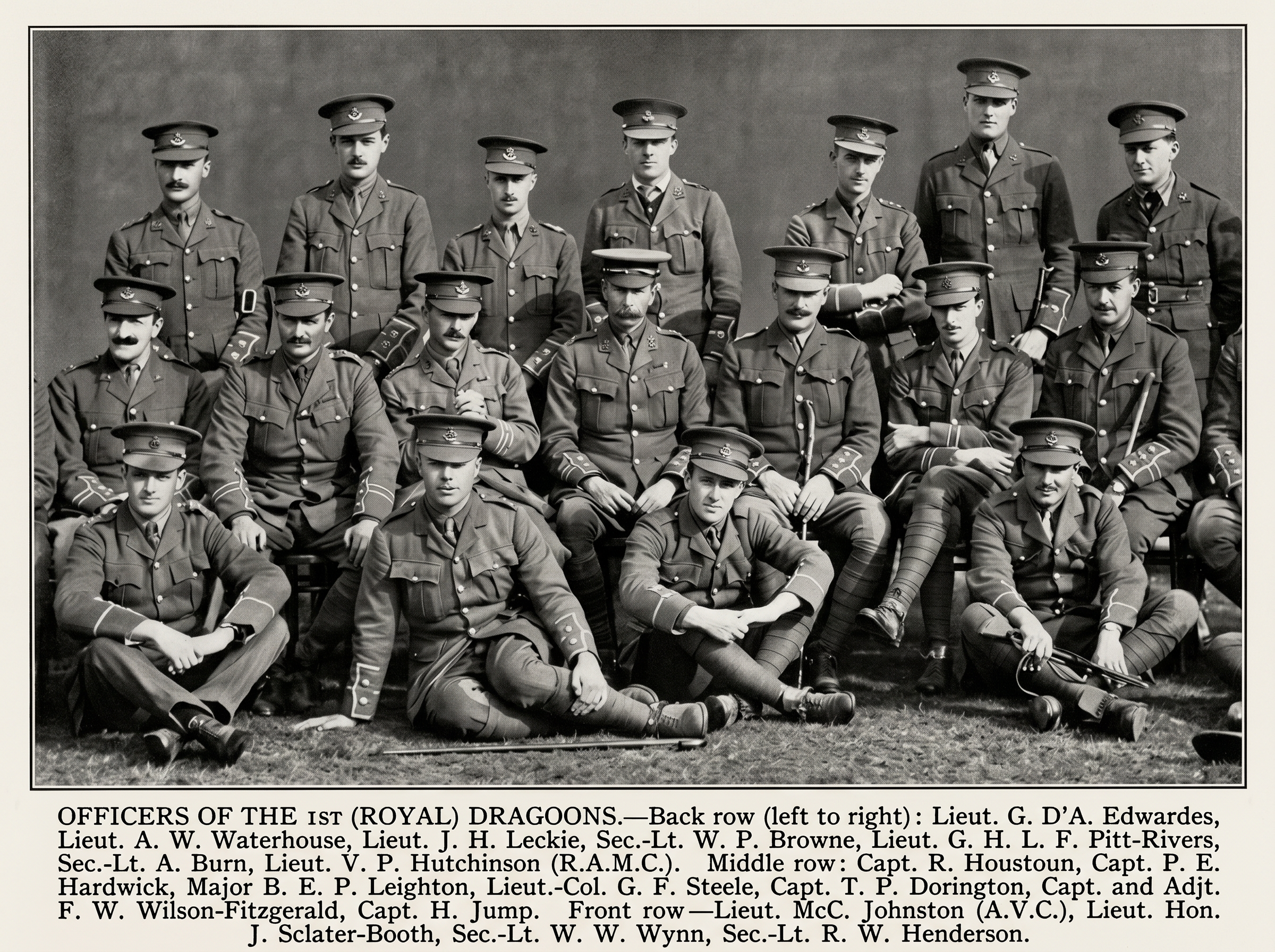 OFFICERS OF THE 1ST (ROYAL) DRAGOONS.—Back row (left to right) : Lieut. G. D. A. Edwardes, Lieut. A. W. Waterhouse, Lieut. J. H. Leckie, Sec.-Lt. W. P. Browne, Lieut. G. H. L. F. Pitt-Rivers, Sec.-Lt. A. Burn, Lieut. V. P. Hutchinson (R.A.M C.). Middle row : Capt. Houstoun, Capt. P. E. Hardwick, Major B. E. P. Leighton, Lieut.-Col. G. F. Steele, Capt. T. P. Dorington, Capt. and Adjt. F. W. Wilson-Fitzgerald, Capt. H. Jump. Front row : -Lieut. McC. Johnston (A.V.C.), Lieut. Hon. J. Sclater-Booth, Sec.-Lt. W. W. Wynn, Sec. Lt. R. W. Henderson.