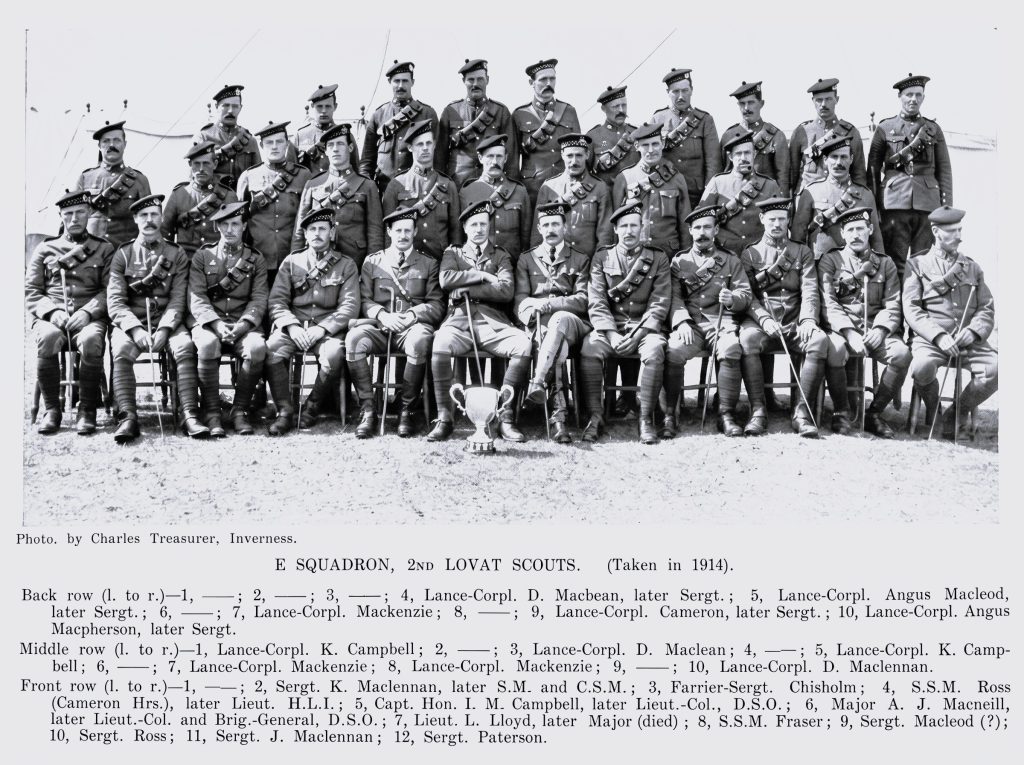 E SQUADRON, 2ND LOVAT SCOUTS. (Taken in 1914). Back row (I. to r.) 1, -; 2, – 3 – 4, Lance-Corpl. D. Macbean, later Sergt. 5, Lance-Corpl. Angus Macleod, later .Sergt.; 6, —;7, Lance-Corpl. Mackenzie; 8,- 9, Lance-Corpl. Cameron, later Sergt. ; 10, Lance-Corpl. Angus MacPherson, later Sergt.