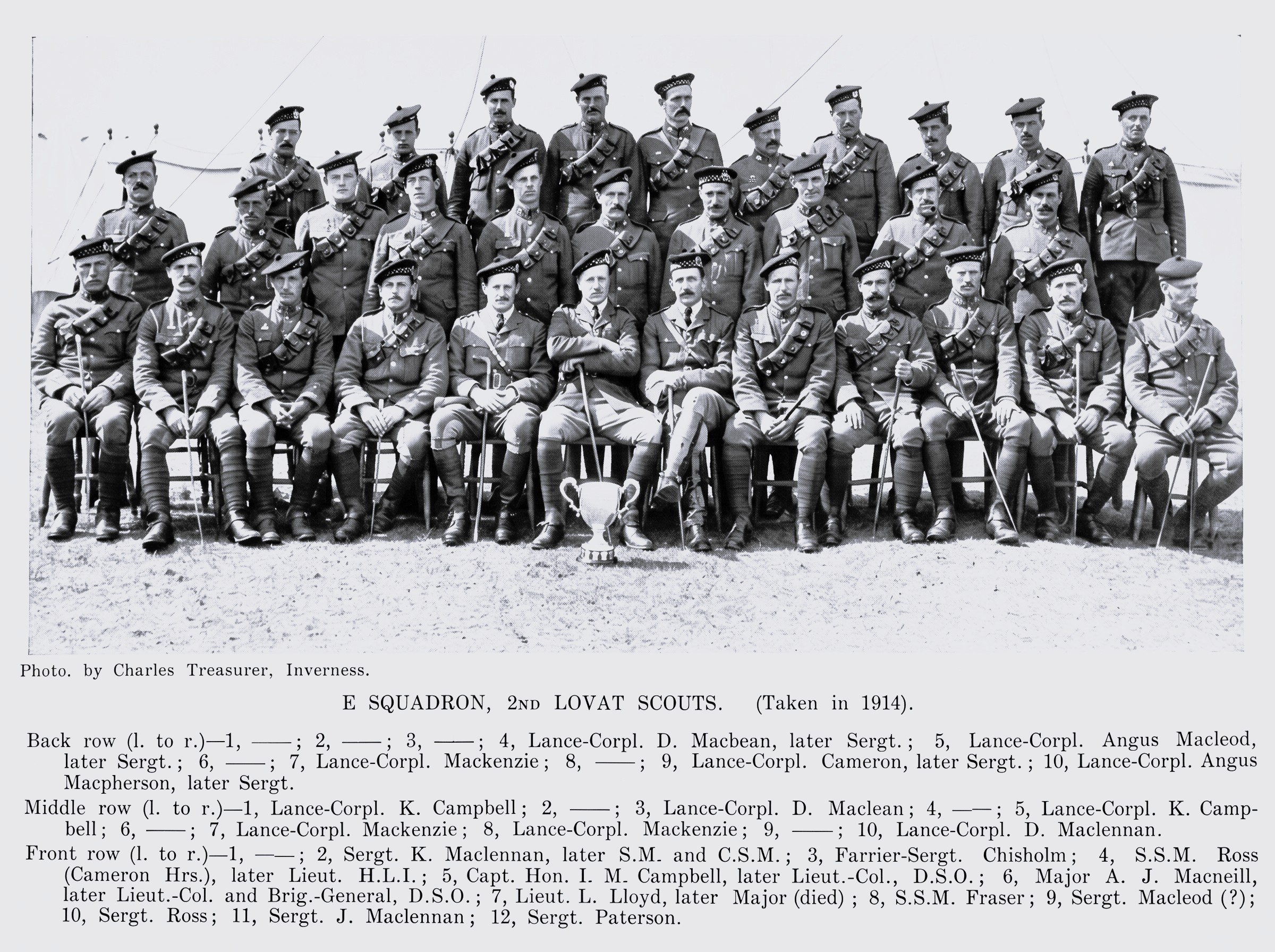 Front row (1. to r.) 1, — 2, Sergt. K. Maclennan, later S.M. and C.S.M. ; 3, Farrier-Sergt. Chisholm ; 4, S.S.M. Ross (Cameron Highlanders) later Lieut. ; Capt. Hon. I. M. Campbell, later Lieut.-Col., ; 6, Major A. J. Macneill, later Lieut.-Col. and Brig.-General, D.S.O.,7, Lieut. L. Lloyd, later Major (died) ; 8, S.S.M. Fraser; 9, Sergt. Macleod (?); 10, Sergt. Ross; 11, Sergt. J. Maclennan; 12, Sergt. Paterson.