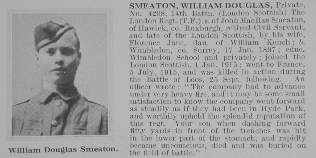 Smeaton W D Pte 4208 14th London Regiment (London Scottish) Posted on 2 July 20232 July 2023 by WW1 Photos Smeaton W D Pte 4208 14th London Regiment (London Scottish) Source : De Ruvigny’s Roll Of Honour Vol 1