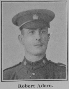 ADAM, ROBERT, Coy.-Sergt.-Major, No. 150017, 8th Battn. Canadian Infantry, Canadian Expeditionary Force, eldests. of Robert Adam, of Sunnyside (now of Ternemny), Knock-by-Keith, by his wife, Annie Gauld; b. Sunnyside, Knock-by-Keith, co. Banff, 10 April, 1891; educ. Ternemny Public School; was in the Lanarkshire Constabulary, but subsequently went to Canada in May, 1912, and settled at Winnipeg, in the employment of the Corporation Company there; volunteered for active service, and enlisted in the Canadian Infantry 1 Aug. 1915; served with the Expeditionary Force in France and Flanders; saw much service there, being twice slightly wounded, and was killed in action on the Amiens front while bravely urging on his men, 9 Aug. 1918. Buried in the cemetery there. His Major wrote: “I must tell you what a dependable soldier Sergt. Adam proved himself to be; time after time he has proved himself an absolutely gallant and faithful soldier. His loss is a very great one to the whole battalion, and I can only express my sincere regret that such a splendid chap should have lost his life,” and the Chaplain: “… I knew your son very well. He was known as a capable N.C.O., and did splendid work on several occasions. He was a straight, manly fellow, and was much liked andrespected by D Coy., of which he was Sergt.-Major.” Unm.