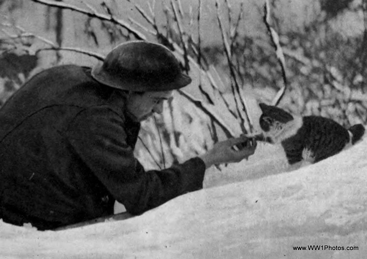 A Soldier Playing With A Kitten In The Snow